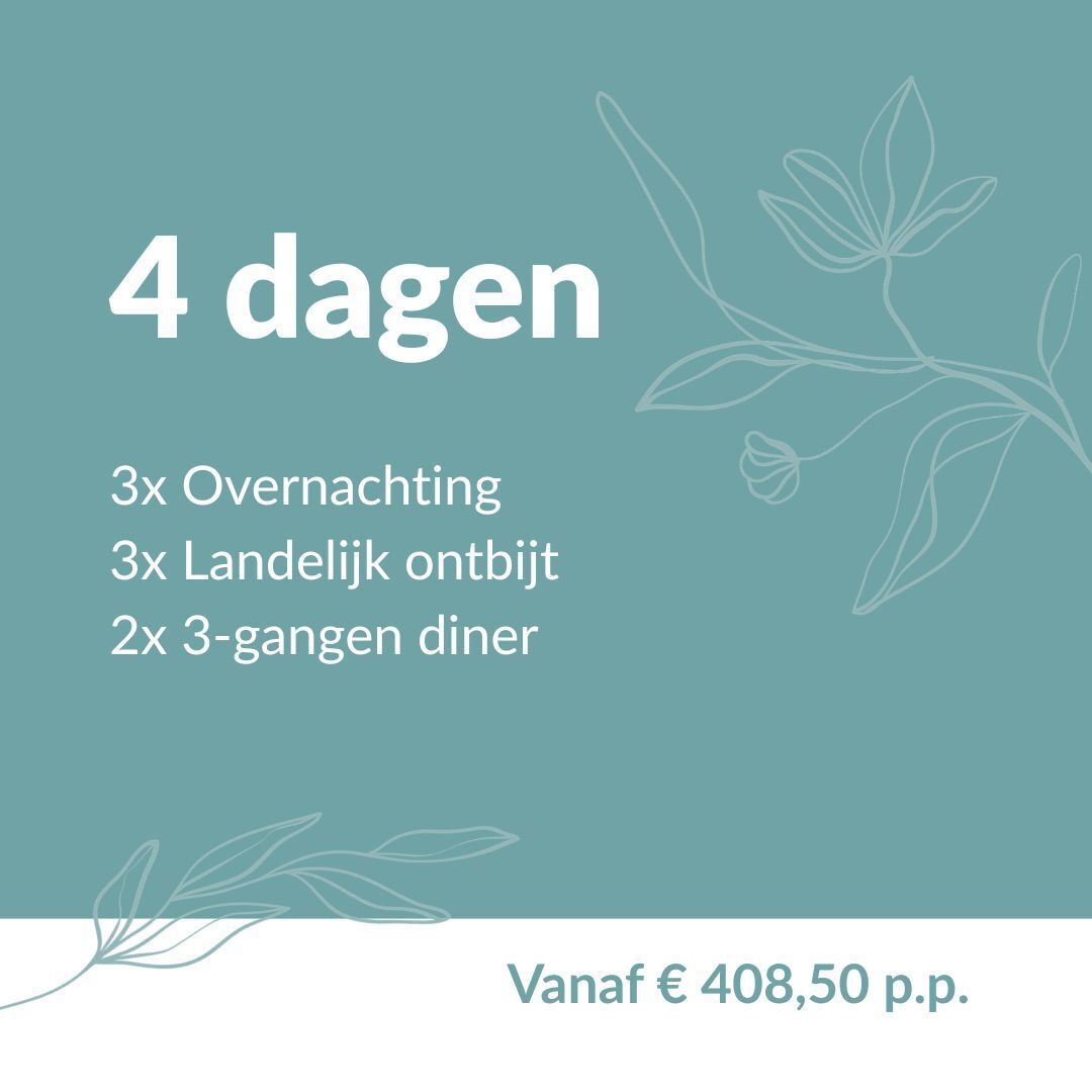 Dit fijne arrangement beweegt met de seizoenen mee. Wil je liever in een ander jaargetijde bij ons verblijven? Reserveer dan het Summer of Love, Heerlijke Herfst of Warme Winter arrangement.